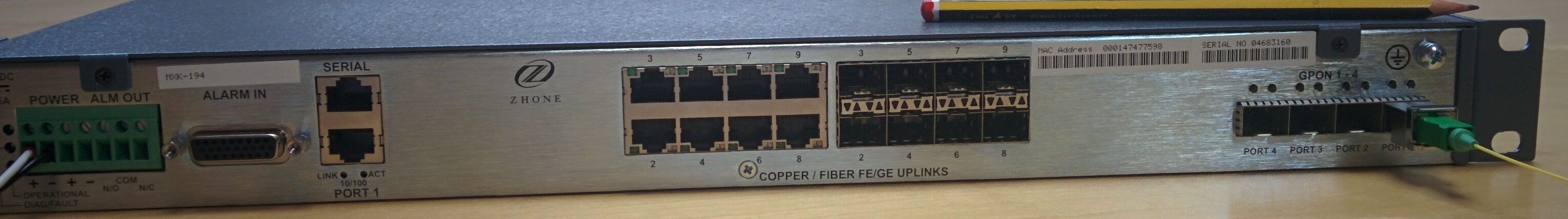 In the picture below we can also see the front of an OLT (hub). The trunk fibres reach it (you can see the GPON ports on the right) and it also has conventional Gigabit Ethernet ports to connect the room services to the IP world (central ports). As its availability is very high (it is operator technology), normally one OLT is installed per hotel, although it is also possible to make redundant configurations for very large projects that require very high availability.