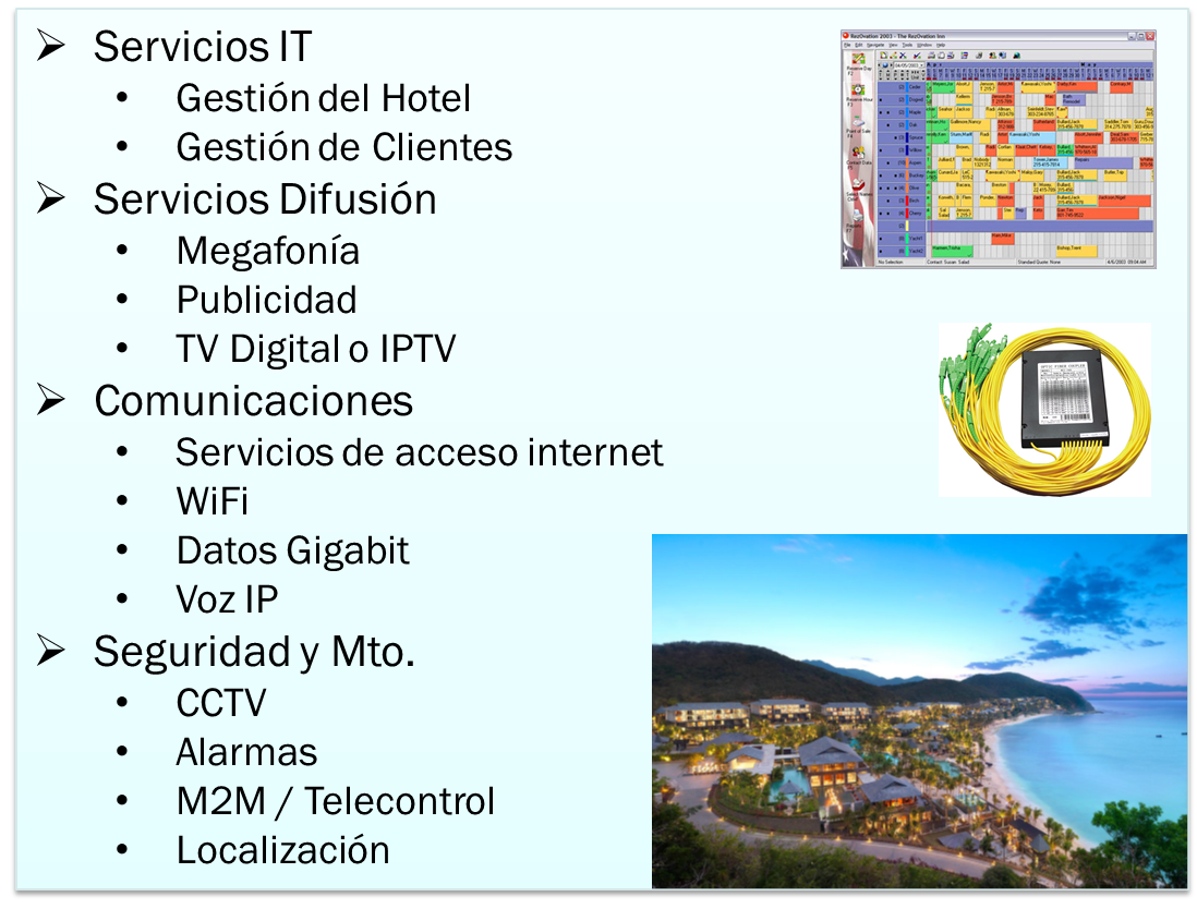 Finally, we would like to point out that Aplicaziones follows the recommendations of the Hotel technology standards and more specifically of the "Fiber To The Room" (FTTR) working group of the Hotel Technology Next Generation (HTNG) association, in order to incorporate the appropriate design criteria and best practices in our projects to guarantee the success of our clients in the Hotel sector.