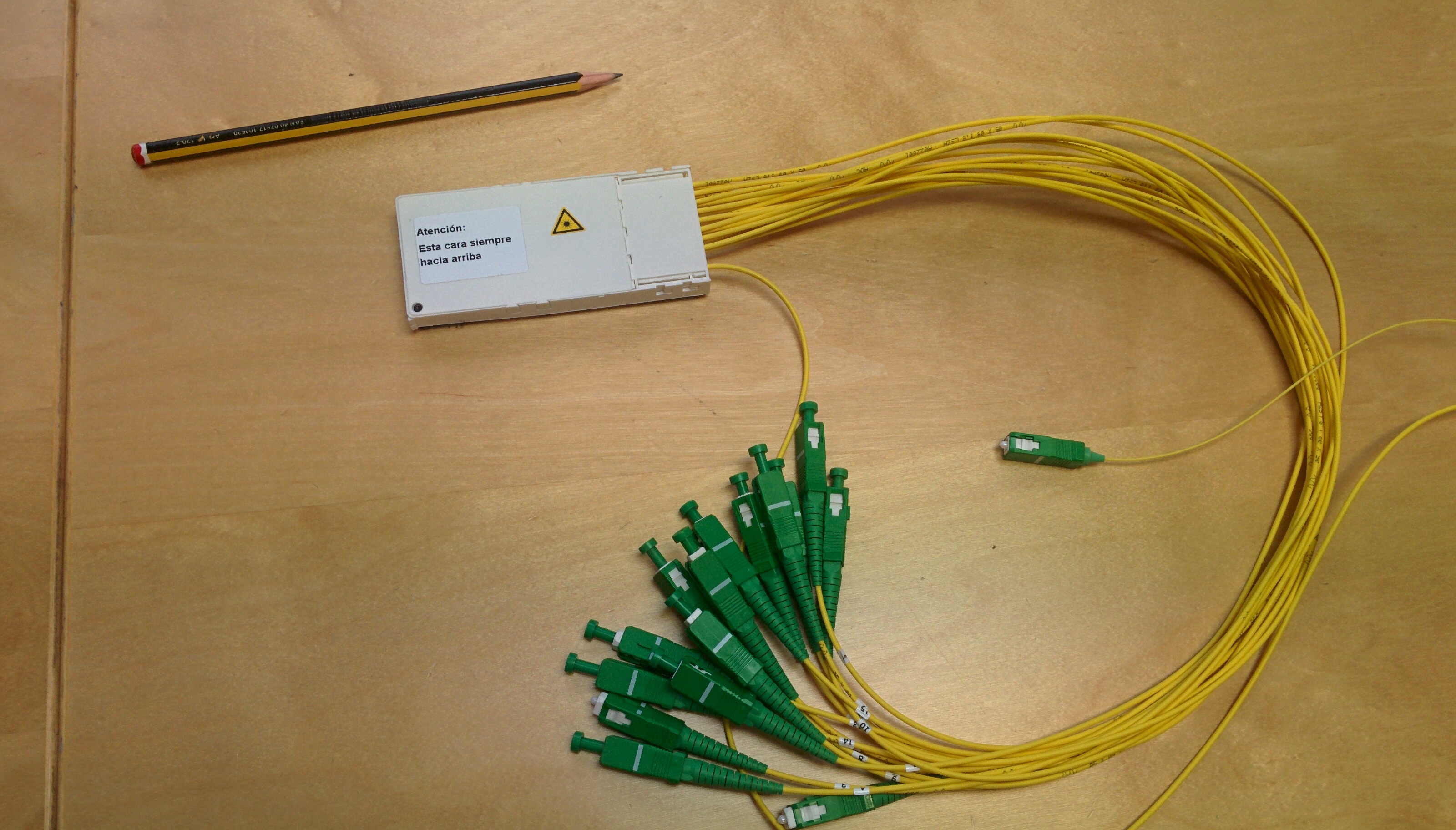 This simplification in design allows savings of more than 50% in rack and conduit space, power consumption, air conditioning and maintenance of electronic equipment. On the other hand, the use of fibre cabling protects the investment in the long term regardless of the adoption of new technological solutions. Attached is a picture of a splitter to be installed in the plants together with the distribution fibres. The small size of the splitter can be seen.